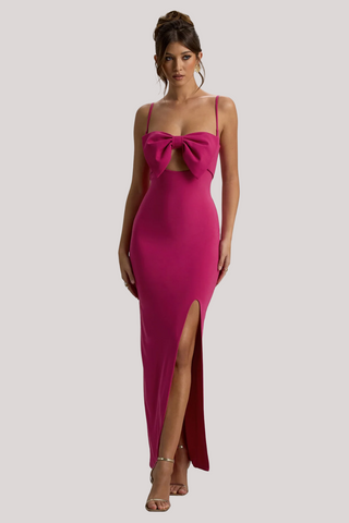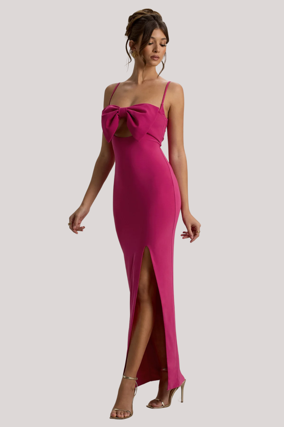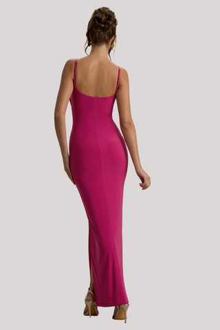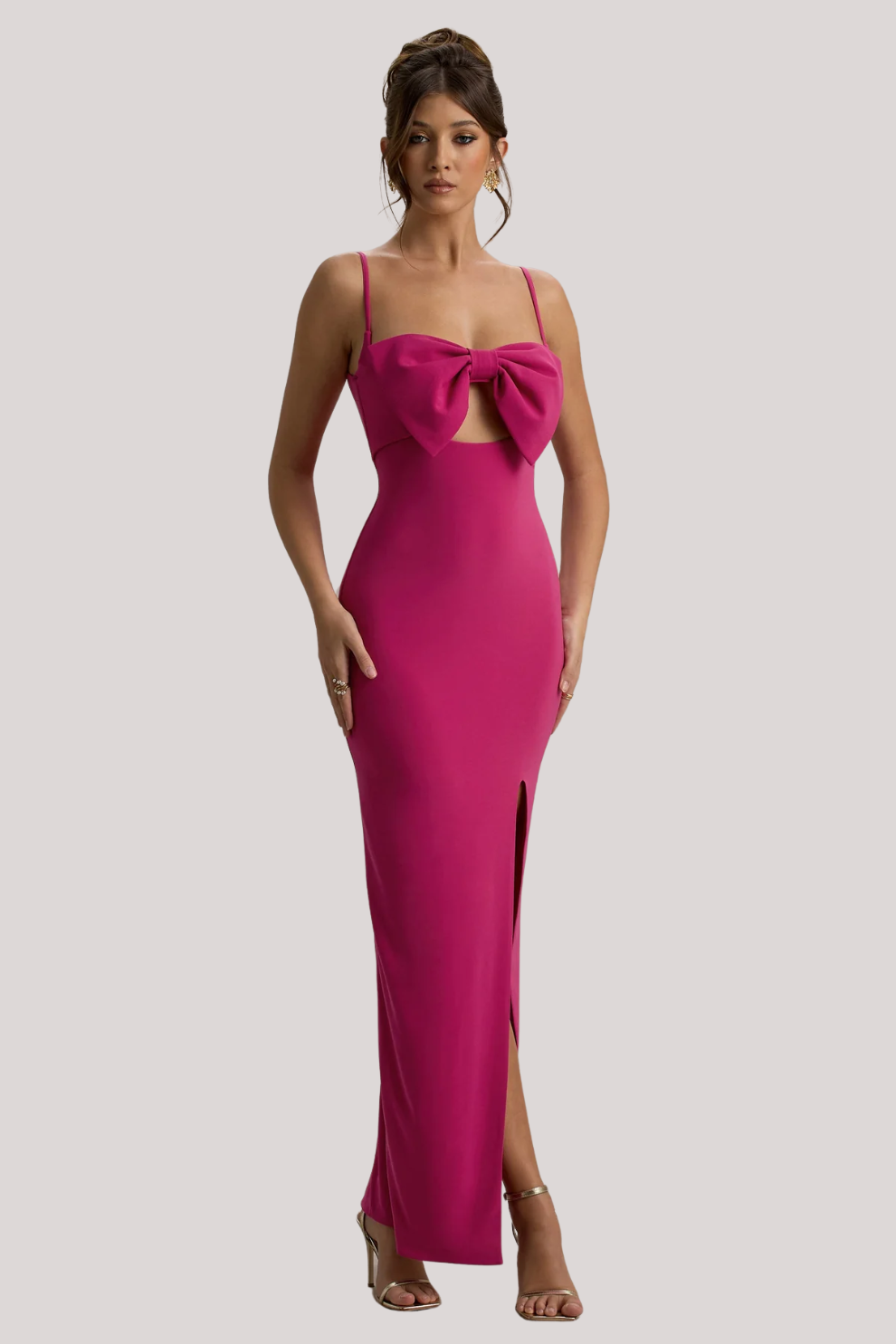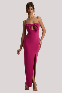 Indulge in timeless luxury this season with the Pink Bliss Maxi Dress. Meticulously designed in our signature stretch jersey, this captivating hot pink dress features a daring chest cut-out, adjustable cami straps, and a bold high-leg split.